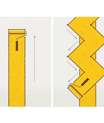 – Để công đoạn sơn phủ được hiệu quả, các chuyên gia thường khuyên bạn nên lăn sơn theo kỹ thuật W. Bạn nên bắt đầu với nửa trên của bức tường để các phần sơn bị nhỏ giọt rơi vào những vị trí chưa sơn. Lăn một sọc sơn lên tường theo hướng từ dưới lên trên sau đó đưa trở về theo hình chữ W, lặp lại các bước trên theo chiều dài của bức tường. Với những phần diện tích mới, các vết sơn cần chồng lên nhau 1/3 inch của các khu vực đã được sơn